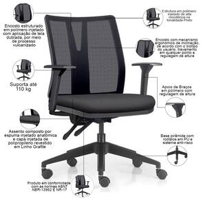 Encosto com mecanismo ergonômico de inclinação, de acordo com o biotipo do usuário, travamento em qualquer ponto e regulagem de altura.