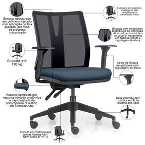 Color: PretoAzul | ColorFamily: Preto | ColorSimple: Preto | ColorSupplier: PretoAzul | Com apoio de braços: Sim | Com aro para pés: Não | Com rodas: Sim | Cor: PretoAzul | Formato de venda: Unitário | Materiais do aro para pés: na | Material: Polímero injetado, espuma injetada, tela dublada vulcanizada, rodízios em PU, revestimento em Sintét | Material do estofamento: Espuma Injetada | MaterialFamily: Polímero | Model: Flow Diretor | Modelo: Flow Diretor | Modelo detalhado: Flow Diretor | OriginCountry: Brasil | OriginState: PR | ProductContents: 01 Cadeira de Escritório | ProductHeight: 81 cm | ProductInstructions: Produto para uso em ambiente interno, nao devendo ficar exposto ao sol, calor e umidade excessivos. | ProductLength: 71 cm | ProductWarranty: 90 dias após o recebimento do produto | ProductWeight: 13 kg | ProductWidth: 71 cm | Requer montagem: Sim | SizeDescription: Altura: 81 cm x Largura: 71 cm x Profundidade: 71 cm | SupplierSimpleName: Cadeira de Escritório Giratória Diretor Flow F02 Base Preta Sintético Azul - Lyam Decor | Tipo de cadeira de escritório: Diretor Giratória