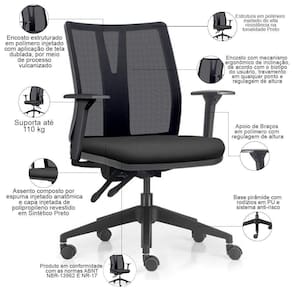 Peso máximo suportado 110 kg, com uso recomendado de 8 horas diária.