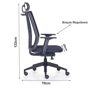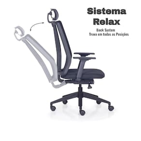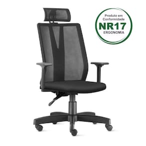 Descrição Técnica do Produto: Encosto estruturado em quadro injetado em resina termoplástica de alto desempenho, polipropileno com adição de fibra de vidro, material de excelente tenacidade e ótima resistência mecânica, 100% reciclável, com encosto de cabeça, estofado com tela flexível a base de poliéster. Assento estruturado em compensado multi laminado e estofado em espuma flexível injetada de poliuretano, revestimento em tecido tipo crepe. Braços reguláveis em altura através de botão gatilho, contendo apoia braço em Polipropileno. Mecanismo Back System que possibilita ajuste de altura do assento, ajuste de altura e inclinação do encosto, de maneira independente entre si. Pistão classe 4 com 120 mm de curso. Base em aço com capa em Polipropileno de alta resistência. Rodízios de nylon.