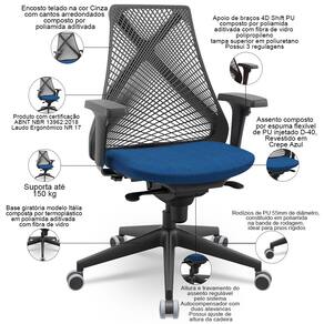 A começar pelo encosto telado com desenho X, que proporciona excelente ventilação e se adapta perfeitamente às curvas da sua coluna, oferecendo suporte lombar personalizado, ao passo que os braços com 3 tipos de regulagem com ajuste da altura, o giro e o avanço horizontal, tudo para que você encontre a posição ideal e evite tensões nos ombros e braços. Além disso, a essa cadeira giratória com rodízios permite fácil movimentação e rotação de 360°, otimizando o seu espaço de trabalho.
