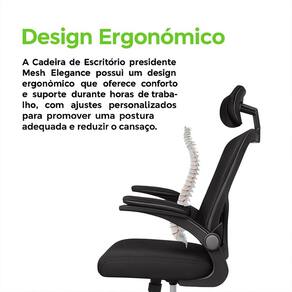 Cadeira de escritório presidente mesh elegance preta Você já parou para pensar no impacto que uma cadeira de qualidade pode ter no seu desempenho diário Seja no trabalho, nos estudos ou nos momentos de lazer, a escolha certa faz toda a diferença. É por isso que apresentamos a cadeira para escritório presidente mesh elegance preta, a companheira ideal para as longas jornadas de produtividade e conforto. Imagine-se aproveitando horas de trabalho sem desconfortos, estudos sem interrupções e até mesmo momentos de lazer sem preocupações com postura. Com um design elegante e moderno, essa cadeira se integra perfeitamente a qualquer ambiente, proporcionando um toque de sofisticação onde quer que esteja. O diferencial A combinação perfeita entre ergonomia e estilo. Nossas cadeiras foram projetadas para garantir não apenas o máximo conforto, mas também uma estética que se destaca. Assuma o controle do seu espaço de trabalho ou estudo com a cadeira para escritório presidente mesh elegance preta, e descubra como o equilíbrio perfeito entre conforto e produtividade. Diferencias da cadeira 1 apoio de cabeça com ajuste 3d Apoio de cabeça ajustável em sete níveis de altura e angulação, garantindo o máximo conforto. Escolha a posição adequada e alivie a pressão cervical. Além disso, a cadeira pode ser utilizada sem o apoio de cabeça. 2 apoio de braços Os braços da cadeira são retráteis, facilitando o encaixe nas mesas e proporcionando versatilidade. Além disso, eles são revestidos com tecido em poliéster, o mesmo utilizado no assento, garantindo conforto durante a jornada de trabalho. 3 sistema relax A cadeira possui um sistema relax para momentos necessários de pausa durante a jornada de trabalho, proporcionando descanso. Nosso sistema permite inclinar até 135, garantindo conforto em diferentes posições. 4 tecnologia mesh A cadeira de escritório presidente mesh elegance emprega a avançada tecnologia mesh, um material que proporciona uma superfície respirável e confortável que evita o acúmulo de calor e umidade para quem enfrenta várias horas de rotina de trabalho. 5 design ergonômico A cadeira de escritório presidente mesh elegance possui um design ergonômico que oferece conforto e suporte durante horas de trabalho, com ajustes personalizados para promover uma postura adequada e reduzir o cansaço. 6 bases e rodas A base e as rodas da cadeira de escritório presidente mesh elegance garantem estabilidade e mobilidade suaves, tornando seu trabalho mais confortável e eficiente. 7 montagem Medidas principais - base até topo do encosto de pescoço: 110 cm até 122,5 cm; - base até assento: 44 cm até 53 cm; - assento até topo do encosto de pescoço: 69 cm até 73 cm. - largura encosto de costas: 49 cm; - largura entre os braços externos : 59 cm; - largura total entre as rodas: 65 cm. Dúvidas frequentes 1 como funciona a política de troca e devolução do produto Seguindo as diretrizes do código de defesa do consumidor, o cliente pode solicitar a devolução do seu produto em até 7 dias após a compra, ou solicitar a troca em caso de defeitos ou outros motivos. 2 o produto possui Valorizamos a satisfação e a confiança dos nossos clientes. Todos os nossos produtos possuem de 12 meses contra defeitos de fabricação. Caso ocorra algum problema com seu produto dentro do período de , nossa equipe estará pronta para solucioná-lo rapidamente e com eficiência. Estamos sempre disponíveis para ajudá-lo e garantir a sua satisfação com a sua compra. 3 qual o peso máximo suportado pela cadeira Nossas cadeiras suportam até 130 kg.