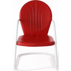 - Retrocesso retrô: esta cadeira de metal para ambientes externos dá vida ao charme vintage com seu acabamento brilhante vermelho brilhante e encosto redondo com ranhuras decorativas.