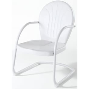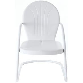 - Retrocesso retrô: esta cadeira de metal para ambientes externos dá vida ao charme vintage com seu acabamento brilhante branco vibrante e encosto redondo com ranhuras decorativas.