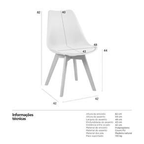 Cadeira modelo Leda: Material do encosto: Polipropileno - Material do assento: Couro PU - Material dos pés: Madeira natural - Altura do encosto: 82 cm - Altura do assento: 44 cm - Largura do assento: 48 cm - Profundidade do assento: 43 cm - Distância entre os pés: 42 cm - Peso suportado: 130 kg - Garantia: 3 meses.