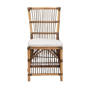 Digna e casual, a cadeira de jantar Kim confere um ar de tranquilidade a qualquer ocasião gastronômica. Feita na Indonésia, esta peça de estilo boêmio consiste em uma estrutura de rattan natural feita à mão equipada com uma almofada de assento estofada em tecido macio. Seu distinto encosto se curva suavemente para um abraço aconchegante, enquanto hastes finas de vime adornam a peça para uma exibição arejada. A Kim chegará totalmente montada e apresentará uma saia de vime esvoaçante com pernas anguladas para excelente estabilidade e suporte. Exalando elegância despreocupada, a cadeira de jantar Kim adiciona um toque boho a qualquer ocasião de jantar. Devido à natureza dos materiais naturais utilizados neste produto, ela pode ter variações em áreas como, mas não se limitando a, cor, padrão, grão e textura. Os fios de vitan/fibra de rattan em forma de pêlo são comuns devido à natureza do material.