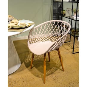 Uma cadeira versátil, perfeita para vários ambientes : desde a mesa de jantar, ao aconchego do quarto. Cadeira com assento em PP, com braços e encosto. Possui base fixa em metal adesivado com textura em madeira.