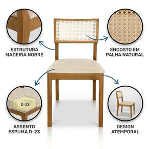Fabricada com estrutura em madeira nobre de jequitibá cor Mel, a Cadeira Millie oferece resistência e durabilidade excepcionais. Seu assento conta com espuma D-23 garantindo conforto prolongado, enquanto o revestimento em couríssimo adiciona textura, charme e aconchego ao ambiente. O encosto em palha natural se encarrega de dar o toque final a peça.