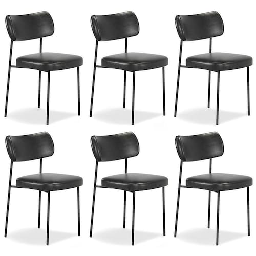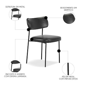 Peso Suportado: 120Kg, sem impacto.Revestimento: Sintético.Possui Pés: Sim.Material dos Pés: Metal.Acabamento: Pintura epóxi.Possui Rodízios: Não.Diferenciais:- Design Moderno.- Estilo Industrial.- Acabamento de ótima qualidade.- Pés metálicos.Sistema de Montagem: Parafusos/Ponteiras. Necessita Montagem: Somente parafusar a base metálica e encaixar a ponteira.Manual de Montagem: Sim.Complexidade da Montagem: Baixo.Volumes: 2 Volumes.Conteúdo da Embalagem: 6 Cadeiras. do fabricante: 90 dias contra defeito de fabricação.Montagem: Recomendamos que seja feita por um .Recomendação de Limpeza: Utilize pano levemente úmido.Observações importantes- Produto para uso residencial em ambiente interno, não devendo ficar exposto diretamente ao sol, calor e umidades excessivas.- Pode haver alguma diferença de tonalidade entre a imagem e o produto real, por conta do tratamento de imagens e a calibração de cores do seu monitor.- As imagens são meramente ilustrativas, não acompanham objetos de decoração e eletrônicos.- Ao receber a mercadoria, o cliente deve verificar as condições da embalagem, caso haja alguma não assine o comprovante de recebimento.- Montagem, desmontagem e outras instalações serão de responsabilidade do cliente. Não nos responsabilizamos, no ato da , por subir escadas/elevadores ou pelo transporte por guincho em apartamentos. Eventuais despesas são de responsabilidade do comprador.- Confira as dimensões do produto e certifique-se de que passará normalmente por supostos elevadores, portas, escadas e/ou corredores de sua residência.