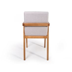 Seu encosto levemente curvado, aliado ao assento estofado em linho, garante conforto ergonômico e um toque sofisticado à decoração. A base em madeira maciça Lyptus Grandis, proveniente de reflorestamento, confere resistência e durabilidade. O acabamento em selador nogueira fosco realça o visual contemporâneo e refinado.