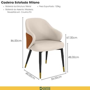 Tonalidade: Bege/Caramelo | Altura: 86 | Produto: Cadeira Estofada Milano | Largura: 56 | Material da Estrutura: Metal | Bege/Caramelo | Peso do Produto: 10 | Fabricante: Magazine De| Cômodo Indicado: Cozinhas | Acompanha Braço: Não | Necessita Montagem: Não | Peso do item: 10 | Palavras-chave de Pesquisa: Cadeira Milano, Cadeira Estofada Milano, Cadeira de Jantar Estofada Milano, Cadeira de Jantar Bege Milano | batteries_required: Não | included_components: 1 Cadeira | is_fragile: Não | part_number: 1 | number_of_boxes: 1 | model_number: 1 | item_package_weight: 10 | bullet_point#0: A Milano foi pensada para transformar a rotina da sua mesa em um momento de elegância e acolhimento. Com curvas suaves e presença marcante, ela soma sofisticação sem pesar no ambiente, harmonizando com mesas | bullet_point#1: O assento amplo e macio acomoda com folga, enquanto a curvatura do encosto apoia naturalmente a lombar. Os braços na altura certa aliviam a postura e tornam agradáveis refeições longas, conversas e trabalho leve à mesa. | bullet_point#2: A Cadeira Milano é revestida em PU de toque macio e fácil limpeza, combinado ao painel externo com um botão dourado que confere charme artesanal. A estrutura do assento e do encosto é em madeira, | number_of_items: 1 | Coleção Jardim: Não | Selecione: Cadeira Estofada Milano | O Produto pode Expirar: Não | Fonte de energia: Não Aplicável | Certificação de teste externa: Não | Dimensões do artigo: 86x56x49 | Dimensões do item P x L x A: 86x56x49 | Certificado de Conformidade do Produto: Não