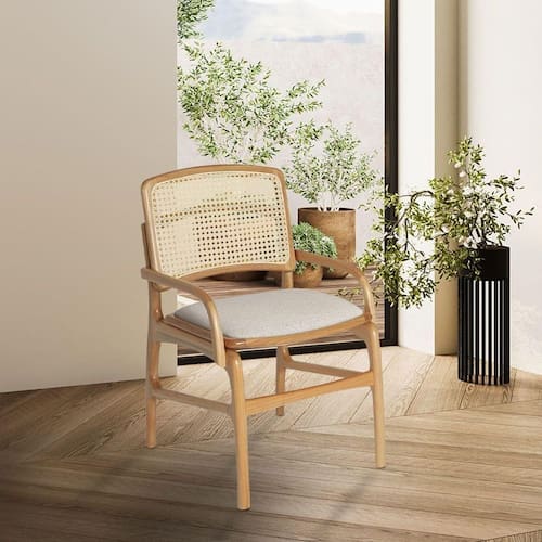 AS IMAGENS SÃO MERAMENTE ILUSTRATIVAS E PODEM SOFRER VARIAÇÕES DE COR E PEQUENOS DETALHES DE ACORDO COM O SEU MONITOR, ILUMINAÇÃO DO AMBIENTE E ATÉ MESMO A SUA PERCEPÇÃO VISUAL.Cadeira de Jantar FlorenÃa Madeira Jequitibà Natural com Estofado Linho Bege Encosto de Palha e BraÃo