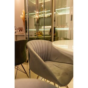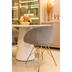 As peças com metais dourados estão super em alta no mundo do design, além do veludo que também é uma tendência muito forte para os estofados. A Cadeira Eleonora combina estes dois atributos e garante uma pela elegante e funcional para seu dia a diaCadeira fixa para utilização em ambientes internos, não possui apoio para braços, possui encosto para as costas, assento estofado com estrutura em polipropileno PP e revestido em tecido aveludado. Possui base fixa em aço cromado na cor dourada.