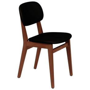 Cadeira sem braços de madeira tauarí.Acabamento com verniz tingido de amêndoa. Assento e encosto estofado em couríssimo preto.Produto é entregue montado.