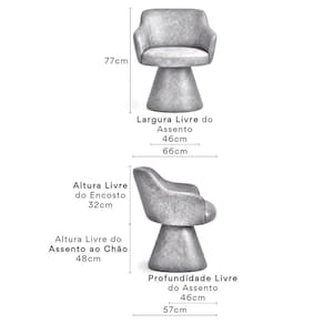 Medidas Altura Total: 77 cm Largura: 66 cm Profundidade: 57 cm Peso: 15 kg Outras Medidas: Altura do Encosto: 32cm Altura do Assento ao Chão: 48 cm Largura do Assento: 46 cm Profundidade do Assento: 46 cm
