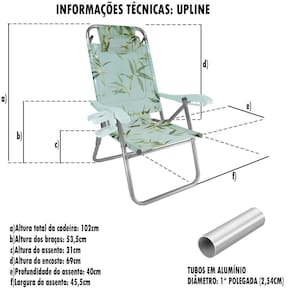 Mais resistente e confortável;Não enferruja, dobradiças em alumínio;Tubos em alumínio de 1 polegada;5 posições com almofada anatômica;Tecido de alta resistência, soldado eletronicamente;Braços com engate para porta copos.Itens inclusos: 01 Cadeira Up Line Alumínio com almofada, 01 porta copo