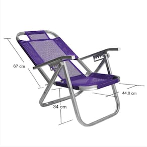 Cadeira de Praia Reclinável Alta Ipanema Roxa CAD0394 Botafogo A Cadeira de Praia Reclinável Alta Ipanema Roxa é a escolha definitiva para quem busca conforto, design e durabilidade em seus momentos de lazer. Parte do segmento premium da Botafogo Lar & Lazer, a cadeira Ipanema se tornou a queridinha dos cariocas e está presente em diversas praias do Rio de Janeiro. Ideal para quem valoriza um produto 100% nacional e sustentável, a cadeira oferece praticidade e um toque de sofisticação à beira-mar. Com estruturas de alumínio retangular, reforçada para garantir resistência e leveza, e assento em tela de PVC Sannet, ela proporciona o máximo de conforto e durabilidade. A cadeira é dobrável e reclinável em até 5 posições, permitindo o ajuste perfeito para seu descanso, seja para relaxar ou curtir o sol com estilo. Especificações: Medidas da Cadeira Aberta:Largura do Assento: 44 cmAltura do chão ao assento : 34 cmAltura do Encosto: 67 cmMedidas quando fechada:Comprimento x Largura x Altura L x C x H : 58 x 9,5 x 82,5 cmPeso: 2,70 kgCapacidade Máxima: 120 kgCor: Roxa de 3 meses fornecida pelo fabricante. Imagens meramente ilustrativas. Código Interno: 230656 Modelo: CAD0394 EAN: 7908155402065 Marca: Não Informado