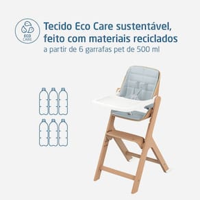 A Cadeira de Refeição Nesta une conforto, segurança e design atemporal para acompanhar o crescimento do bebê desde os 6 meses, com o Kit Baby & Toddler, até a fase adulta. Seu estilo moderno e versátil harmoniza com qualquer ambiente, oferecendo praticidade no dia a dia da família.\n \nProduzida em madeira de faia com tecido Eco Care, feito 100% de garrafas PET recicladas, a Nesta proporciona durabilidade, resistência e toque agradável. O assento ajustável em três alturas, o apoio para os pés com regulagem e o encosto reclinável garantem conforto e postura adequada em todas as fases de uso.\n \nSustentável e funcional, a Nesta possui revestimento impermeável e lavável à máquina, acabamento liso e estrutura ergonômica que acompanha o crescimento até a vida adulta. Um produto resistente, bonito e consciente que transforma cada refeição em um momento de bem-estar e conexão.\n \nPrincipais características:\nAcompanha desde os 6 meses até a fase adulta\nInclui Kit Baby & Toddler com bandeja, barra entrepernas e cinto de 5 pontos\nEncosto reclinável com 2 posições e assento com 3 ajustes de altura\nApoio para os pés ajustável em 3 níveis\nEstrutura ergonômica em madeira de faia\nTecido Eco Care 100% reciclado de garrafas PET\nRevestimento impermeável e lavável à máquina\nAcabamento liso, resistente e fácil de limpar\nSuporta até 110 kg\n \nEspecificações técnicas:\nPosições de altura: 3 posições do assento\nEncosto reclinável: 2 posições (uso a partir dos 6 meses)\nBandeja: sim\nPorta-copo: não\nApoio para os pés: ajustável em 3 posições\nDobrável: não\nDesmontável: sim\nCinto de segurança: 5 pontos ajustável\nLimpeza: capa removível e lavável em máquina; estrutura limpar com pano macio\nComposição/material: madeira, poliéster, PU\nPeso do produto: 7,2 kg\nDimensões (A x L x P): 100 x 46 x 72 cm\nRegistro Inmetro: 002354/2025\n \nImagens meramente ilustrativas. As cores podem variar entre as imagens e o produto.