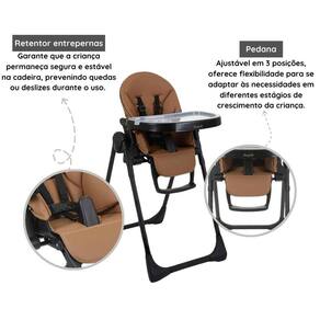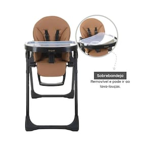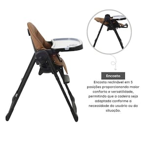 Características Técnicas: Cor predominante: caramelo Peso máximo recomendado: 15 kg Sobrebandeja removível que pode ir ao lava-louças Assento ajustável em 7 posições de altura Encosto reclinável em 5 posições Pedana ajustável em 3 posições Cinto de segurança de 5 pontos, com regulagem na antura dos ombros Retentor entrepernas Nos primeiros meses pode ser usada como cadeira de descanso Muito compacta quando fechada