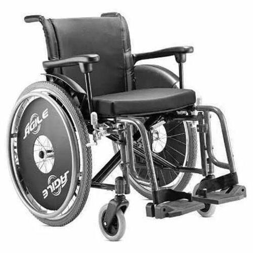 Cadeira De Rodas Alumínio Ágile 44cm Preta - Baxmann E Jaguaribe Construída em alumínio aeronáutico· estrutura dobrável em duplo x· pintura epóxi· estofamento em nylon acolchoado· almofada em espuma injetada· rodas traseiras de 24, em nylon com pneu inflável· rodas dianteiras de 6 maciças,com garfos de nylon· sistema de desmontagem rápida nas quatro rodas quick release· freios bilaterais· protetores de roupa em nylon com abas· pedal removível e ajustável em altura· apoio de braços escamoteáveis· capacidade para 120 kg· largura do assento: 40cm