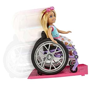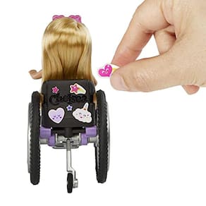 PRODUTO INTERNACIONAL. As bonecas e brinquedos Chelsea estimulam a imaginação das crianças a explorar o mundo em suas infinitas possibilidades. Com a boneca Chelsea em cadeira de rodas, as crianças podem adicionar ainda mais inclusão em suas coleções. Essa boneca, com detalhes realistas e rodas giratórias, acompanha uma rampa de acessibilidade e adesivos para personalizá-la.
