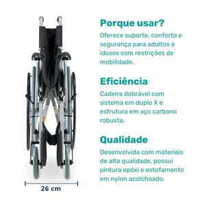 Seu design apresenta um chassi tubular de aço carbono com revestimento epóxi, proporcionando uma estrutura robusta e altamente resistente à umidade. Além disso, a cadeira de rodas D100 possui uma estrutura dobrável, equipada com o sistema em duplo X, garantindo praticidade no transporte e armazenamento.