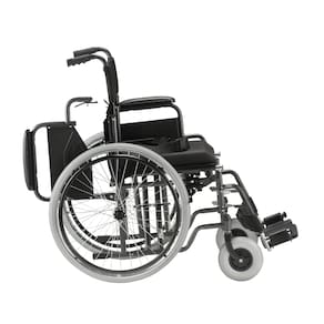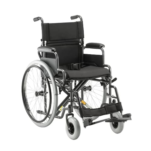 - Suporta até 120 kg com estrutura reforçada em aço carbono - Cadeira dobrável com sistema duplo X: mais praticidade para guardar e transportar - Encosto rebatível e braços escamoteáveis, facilitando o manuseio e transferências - Quick-release nas rodas traseiras: desmontagem rápida e sem ferramentas - Pneus maciços anti-furo: ideais para ambientes internos e externos - Apoios de braços acolchoados e rebatíveis para conforto e acessibilidade - Apoios de pés ajustáveis e rebatíveis lateralmente (swing-away) - Estofamento impermeável e almofada de alta densidade com capa de nylon - Protetor de roupas e bolsão traseiro para objetos pessoais - Tip assist (auxílio de pé para subir pequenos desníveis) - Tiras de panturrilha e cinto abdominal para maior segurança
