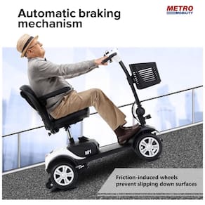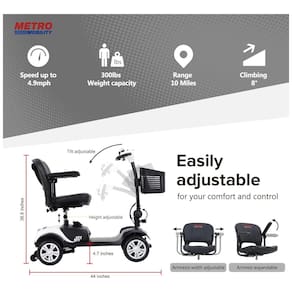 Parâmetros Relacionados: O scooter de mobilidade inclui 1 bateria removível de 12AH. Capacidade máxima de peso de 136 kg. Equipado com pneus sólidos de 23 cm. Pode percorrer 16 km por carga completa e a velocidade máxima pode atingir 8 km/h.