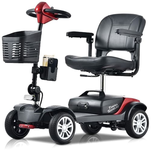 Scooter de Mobilidade: O scooter de 4 rodas Therashieldz mede 112 x 53 x 92 cm e possui freios eletromagnéticos. Projetado para suportar com segurança até 120 kg, o scooter e seus pneus sólidos foram desenvolvidos para durabilidade e segurança. Sua velocidade máxima é de 8 km/h, com raio de giro superior a 1,2 m.
