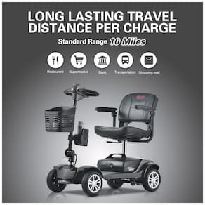 Especificações do Scooter: O scooter Metro Mobility, equipado com um motor potente de 300 Watts, tem alcance de até 16 km por carga. Projetado para suportar com segurança até 136 kg, o scooter elétrico e seus pneus sólidos de 23 cm foram desenvolvidos para oferecer segurança e durabilidade. O raio de giro é de 117 cm e a inclinação máxima é de 10°.