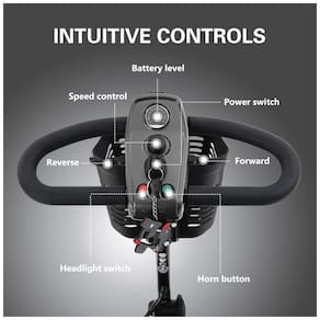 Controle com Uma Mão e Navegação Segura: O scooter de 4 rodas com manoplas ergonômicas permite operá-lo com uma única mão, oferecendo descanso para o pulso. Também é amigável para pessoas canhotas. O scooter motorizado vem equipado com faróis e luzes de freio traseiras, garantindo visibilidade e segurança ao iluminar o caminho e alertar motoristas atrás durante a noite.