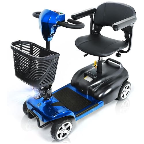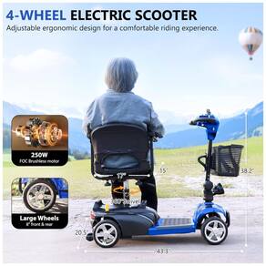 Scooter Motorizada de 4 Rodas: Equipado com motor sem escovas de 250W e bateria de alta eficiência, suporta até 120 kg e possui autonomia de 22 km com velocidade máxima de 8 km/h.