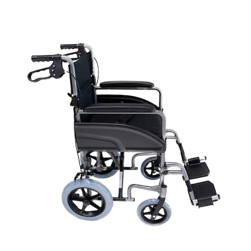 Capacidade de peso: 100kgs Rodas traseiras aro 12?; Almofada de espuma revestida em nylon; Estrutura reforçada em alumínio; Dobrável com X simples; Encosto dobrável; Assento e encosto em nylon resistente; Apoio para os pés rebatíveis, articulados, removíveis, com ajuste de altura; Apoio de braços fixos Faixa de nylon para o apoio do calcanhar; Rodas dianteiras e traseiras em PU, com sistema anti-furo; Garfos em alumínio aeronáutico; Freios em alumínio, bilaterais, nas rodas traseiras; Bolsa para objetos na parte de traseira do encosto; Manoplas anatômicas com freio para condutor; Com registro INMETRO E ANVISA