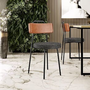 Revestimento do encosto em Couríssimo na cor Camel e do assento em Linho na cor Chumbo, com acabamento semi brilho.