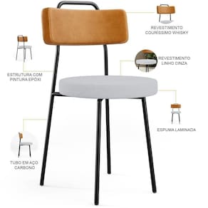 Revestimento do encosto em Couríssimo na cor Whisky e do assento em Linho na cor Cinza, com acabamento semi brilho.