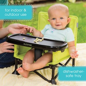 Assento infantil portátil Summer Infant - Dimensões: 38 L x 35,6 P x 38,1 A cm - Para uso com crianças a partir de 6 meses, que pesam até 16,8 kg. - Feito de plástico, nylon, tela e poliéster - Perfeito para brincar ou comer; dentro de casa ou fora - Fixa-se com segurança em cadeiras para adultos