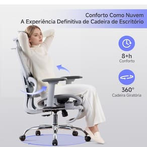 Para momentos de pausa, a cadeira conta com um descanso de pé retrátil posicionado sob o assento, que pode ser estendido conforme a necessidade. Aliado ao sistema de reclinação do encosto, o usuário pode alternar entre a postura de foco total e uma posição de relaxamento, mantendo o suporte ergonômico em ambos os modos. O mecanismo de inclinação é suave e possui trava em diferentes ângulos.