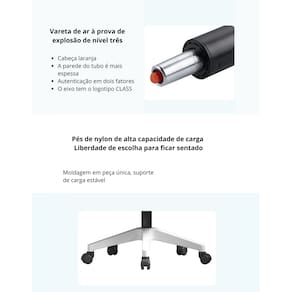 A cadeira conta com um sistema de ajuste de altura para melhor adaptação à sua mesa e uma base resistente com rodízios, que permite deslocamento suave sem danificar o piso. Além disso, a estrutura robusta inclui uma vareta de ar à prova de explosão de nível três, garantindo maior segurança e resistência.