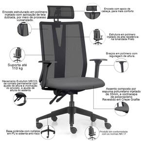 Equipada com um mecanismo Evolution, um sistema de contato permanente, essa cadeira giratória abraça as suas necessidades, permitindo ajustes precisos na altura do assento, do encosto e dos braços. Cada detalhe foi pensado para proporcionar um suporte ideal, respeitando o biotipo do usuário e promovendo uma postura saudável durante longas horas de trabalho. Já a base pirâmide, adornada com rodízios em PU e sistema anti-risco, desliza suavemente sobre qualquer superfície, garantindo movimentos ágeis e seguros. Por fim, o encosto com apoio de cabeça completa a experiência, permitindo que você se concentre no que realmente importa, enquanto sua mente flui livremente.