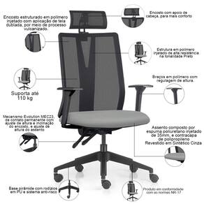 Equipada com um mecanismo Evolution, um sistema de contato permanente, essa cadeira giratória abraça as suas necessidades, permitindo ajustes precisos na altura do assento, do encosto e dos braços. Cada detalhe foi pensado para proporcionar um suporte ideal, respeitando o biotipo do usuário e promovendo uma postura saudável durante longas horas de trabalho. Já a base pirâmide, adornada com rodízios em PU e sistema anti-risco, desliza suavemente sobre qualquer superfície, garantindo movimentos ágeis e seguros. Por fim, o encosto com apoio de cabeça completa a experiência, permitindo que você se concentre no que realmente importa, enquanto sua mente flui livremente.