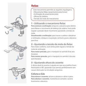 Mecanismo e Base: Relax giratório com trava na posição de operação, sistema de ajuste de tensão do relax e mecanismo a gás para subida e descida do sistema, aranha preta e rodízios de duplo giro de nylon