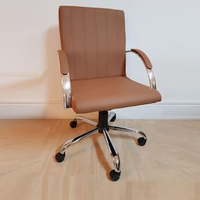 Mecanismo e Base: Relax giratório com trava na posição de operação, sistema de ajuste de tensão do relax e mecanismo a gás para subida e descida do sistema, aranha cromada e rodízios de duplo giro de nylon e Pistão pneumático com acabamento de telescópio preto.