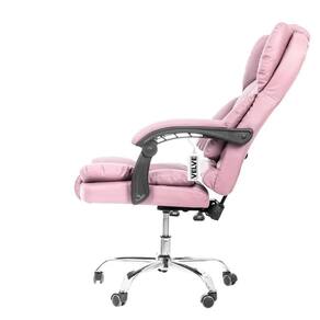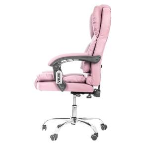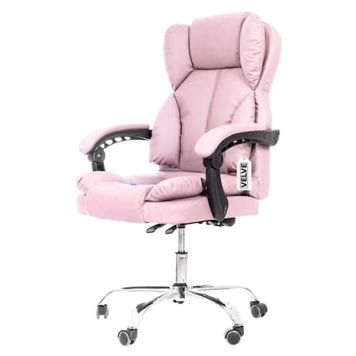 Cadeira Escritório Rosa Presidente Giratória Velve CL10.7 Tenha um item premium no seu escritório A cadeira presidente reclinável da VELVE vai te proporcionar uma experiência única quando se trata de elegância e conforto em seu ambiente de trabalho. A sensação confortável fica por conta da qualidade da espuma e do design do encosto que se adequa a um formato ideal para as suas costas, proporcionando um melhor aproveitamento de suas funções na hora do trabalho. O encosto reclinável com trava em até 70 oferece uma experiência de conforto a mais durante o expediente. Sua estrutura em aço possui ajuste de altura a gás e resistência de até 120 kg. Além disso, as rodinhas da base realizam um giro de 360, promovendo maior mobilidade em sua área de trabalho. O acabamento em couro sintético garante todo o charme e elegância final do item. Tudo isso em só produto