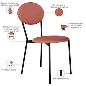 SizeDescription: Altura: 86 cm x Largura: 43 cm x Profundidade: 53 cm | MaterialFamily: Aço, MDP e Couro sintético | ProductWidth: 43 cm | Cor: Terra Rosê | Fabricante: Lyam Decor | Firmeza: Firme | Tempo de montagem: na | ProductHeight: 86 cm | Cor da estrutura da cadeira: Preto | Largura do assento: NA | Largura da cadeira: 43 cm | Espessura do assento: na | Color: Rosa | É dobrável: Não | É empilhável: Não | ProductContents: 01 Cadeira | SupplierSimpleName: Cadeira Estofada Para Sala de Jantar Azuri Preto C01 Courino Terra Rosê - Lyam Decor | ProductLength: 53 cm | OriginState: PR | Material: Estrutura em Aço e MDP, Revestimento em Couro sintético | Model: Azuri | OriginCountry: Brasil | ProductWarranty: 90 dias após o recebimento do produto | ProductInstructions: Produto para uso em ambiente interno, nao devendo ficar exposto ao sol, calor e umidade excessivos. | ProductWeight: 6 kg | Profundidade do assento: 42 cm | Desenho do tecido: Liso | Cor do assento: Rosa | É cadeira de balanço: Não | Material do estofamento: MDP, Espuma D22D28 e Couro sintético | Altura da cadeira: 86 cm | Profundidade da cadeira: 53 cm | Altura do assento a partir do solo: 49 cm | Cor do estofamento: Terra Rosê | Peso máximo suportado: 120 kg | Requer montagem: Não | ColorFamily: Laranja | ColorSupplier: Terra Rosê | ColorSimple: Laranja
