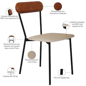 Model: Liora | OriginCountry: | OriginState: PR | ProductContents: 01 Cadeira | SizeDescription: Altura: 81 cm x Largura: 43 cm x Profundidade: 53 cm | SupplierSimpleName: Cadeira Estofada Para Sala de Jantar Liora Preto C01 Linho Areia Courino Caramelo - Lyam Decor | ProductLength: 53 cm | ProductWidth: 43 cm | ProductWarranty: 90 dias após o do produto | ProductHeight: 81 cm | Altura do assento a partir do solo: 49 cm | Requer montagem: Não | Tempo de montagem: na | É dobrável: Não | Peso máximo suportado: 120 kg | É empilhável: Não | Cor: Caramelo | Color: Caramelo | ColorFamily: Caramelo | ColorSimple: Caramelo | ColorSupplier: Caramelo | Cor do estofamento: AreiaCaramelo | Fabricante: Lyam Decor | Material: Estrutura em Aço e MDP, Revestimento em Linho, couro sintético e espuma | MaterialFamily: Aço, MDP, Linho, Couro sintético e espuma | ProductInstructions: Produto para uso em ambiente interno, nao devendo ficar exposto ao sol, calor e umidade excessivos. | ProductWeight: 5,5 kg | Desenho do tecido: Liso | Cor da estrutura da cadeira: Preto | Cor do assento: Caramelo | É cadeira de balanço: Não | Material do estofamento: Espuma D-22 e D-28 | Altura da cadeira: 81 cm | Profundidade da cadeira: 53 cm | Profundidade do assento: 53 cm | Largura do assento: 43 cm | Firmeza: Firme | Largura da cadeira: 43 cm | Espessura do assento: na