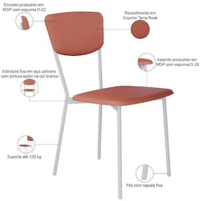 OriginCountry: Brasil | Material: Estrutura em Aço e MDP, Revestimento em Couro sintético e espuma | ColorSupplier: Terra Rosê | Model: Village | OriginState: PR | MaterialFamily: Aço, MDP, Couro sintético e espuma | Color: Rosa | ProductWeight: 6,5 kg | ProductWarranty: 90 dias após o recebimento do produto | ProductLength: 53 cm | ProductWidth: 43 cm | ProductInstructions: Produto para uso em ambiente interno, nao devendo ficar exposto ao sol, calor e umidade excessivos. | ProductHeight: 83 cm | ColorSimple: Rosa | ProductContents: 01 Cadeira | ColorFamily: Rosa | SupplierSimpleName: Cadeira Estofada Para Sala de Jantar Village Branco C01 Courino Terra Rosê - Lyam Decor | SizeDescription: Altura: 83 cm x Largura: 43 cm x Profundidade: 53 cm | Cor: Rosa