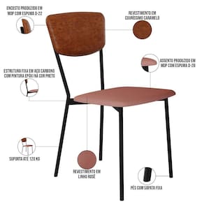 Color: Caramelo | ColorFamily: Caramelo | ColorSimple: Caramelo | ColorSupplier: Caramelo | Material: Estrutura em Aço, MDP, Revestimento em Linho, Couro sintético e espuma | MaterialFamily: Aço, MDP, Linho, Couro sintético e espuma | Model: Village | OriginCountry: Brasil | OriginState: PR | ProductContents: 01 Cadeira | ProductHeight: 83 cm | ProductInstructions: Produto para uso em ambiente interno, nao devendo ficar exposto ao sol, calor e umidade excessivos. | ProductLength: 53 cm | ProductWarranty: 90 dias após o recebimento do produto | ProductWeight: 6,5 kg | ProductWidth: 43 cm | SizeDescription: Altura: 83 cm x Largura: 43 cm x Profundidade: 53cm | SupplierSimpleName: Cadeira Estofada Para Sala de Jantar Village Preto C01 Linho Rosê Courino Caramelo - Lyam Decor