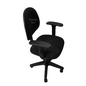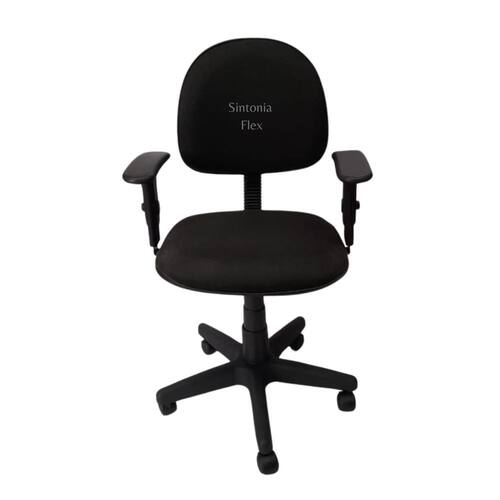 Cadeira executiva giratoria com braço de regulagem de altura e pistão a gás com base de ferro tecido preto Cadeira de escritório Executiva - regulagem de altura a gás - espuma injetada , braço com regulagem - revestida em tecido j.Serrano anti-chama - bordas em pvc flexivel - pintura eletrostatica - base de ferro com capa Marca: Sintonia Flex