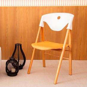 Conta com design diferenciado, ela é uma cadeira montável e sua produção une diversos materiais como: madeira, plástico e metal das peças de fixação.