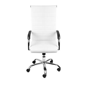 Cadeira Florença Alta Branca em Couro Sintético Base Rodízio possui Assento e encosto em PU, com base cromada giratória, sistema relax e rodízios em PU que não riscam o piso.. Medidas: Altura do chão ao assento: 42 a 51cm / altura do chão ao braço: 62 a 70,5cm / Altura do chão ao encosto: 106 a 113,5cm / Largura: 54cm / Comprimento: 48cm